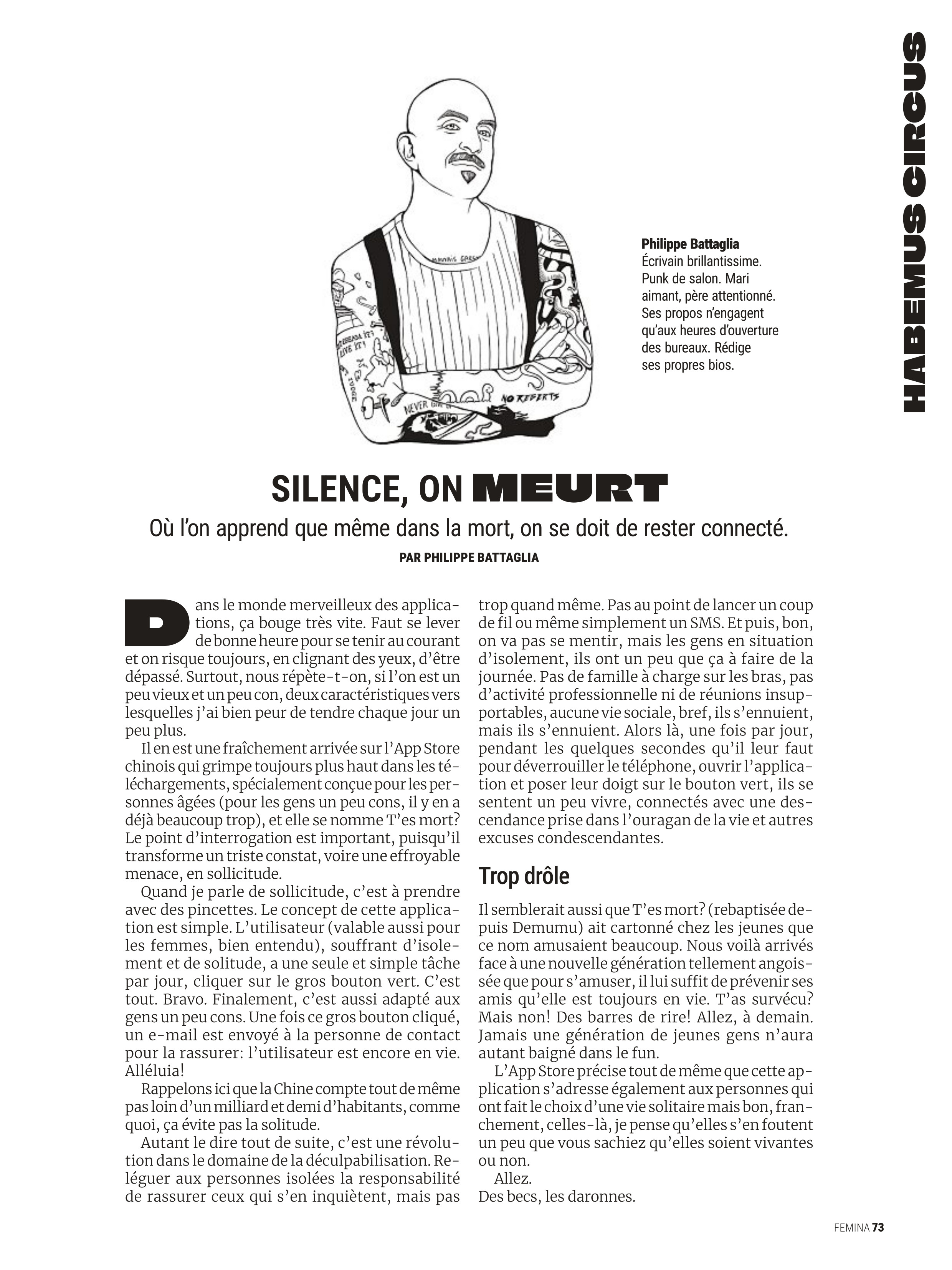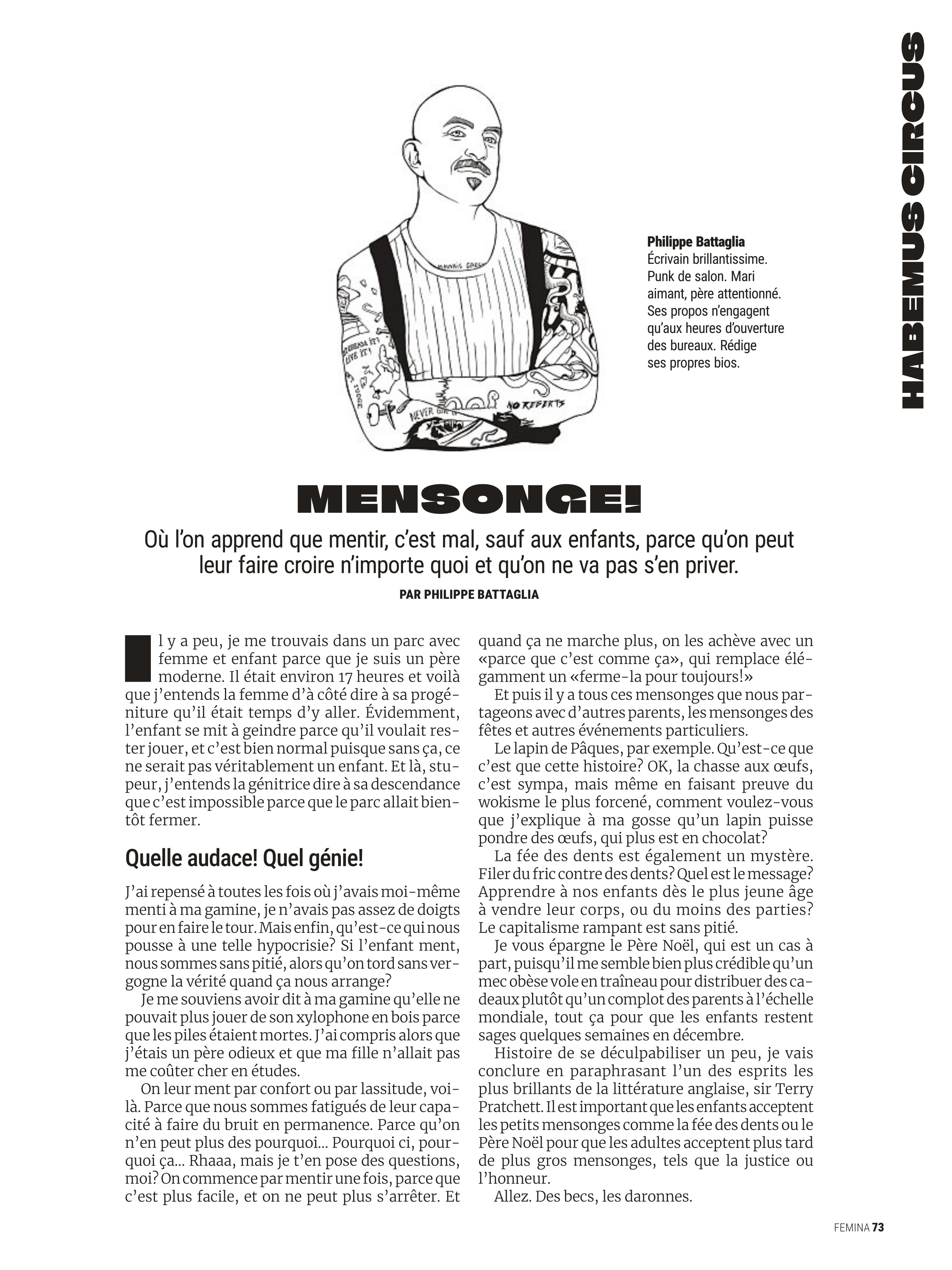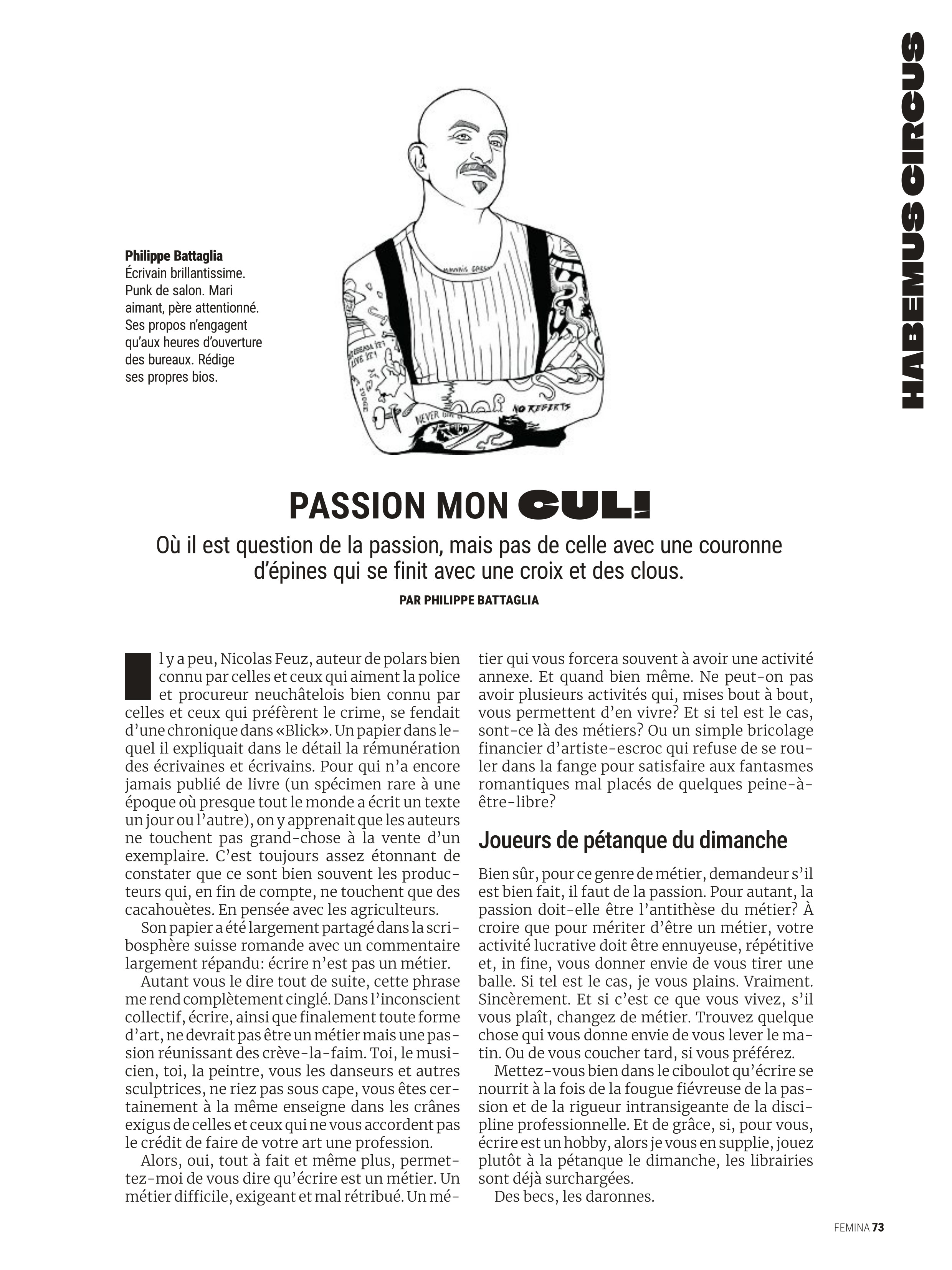 En 2017, Philippe Battaglia s’illustre dans le magazine montheysan Le Vendredi. Dans ses chroniques, il commente, salue, encourage ou critique la vie, l’actualité et les personnalités de la Commune avec une tendresse infinie.